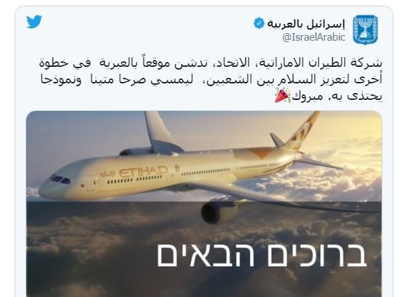 Arapça İsrail sayfası aynı paylaşımda Etihad Havayolları’na tebrik ederek "BAE Etihad Havayolu, İsrail’in ve BAE’nin halkı arasında bağlantıları güçlendirmek için İbranice bir web sitesi başlatıyor. Etihad’ın aldığı adımla iyi ve takip edilecek bir model oldu. Tebrikler" ifadelerini kullandı.