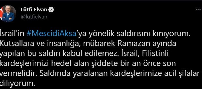 Bakan Elvan, sosyal medya hesabından konuya ilişkin yaptığı paylaşımda, “İsrail’in Mescid’i Aksa’ya yönelik saldırısını kınıyorum. Kutsallara ve insanlığa, mübarek Ramazan ayında yapılan bu saldırı kabul edilemez. İsrail, Filistinli kardeşlerimizi hedef alan şiddete bir an önce son vermelidir. Saldırıda yaralanan kardeşlerimize acil şifalar diliyorum” ifadelerini kullandı.Bakan Elvan, Mescid’i Aksa’da Filistinlilere yapılan saldırıyı kınadı