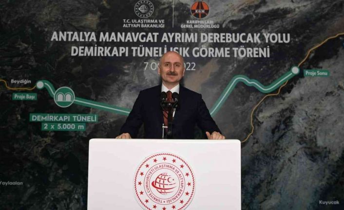 Antalya Demirkapı Tüneli Işık Görme Töreni’ne katılan Ulaştırma ve Altyapı Bakanı Adil Karaismailoğlu, burada yaptığı konuşmada, “Yapım çalışmaları devam eden Antalya-Manavgat ayrımı Taşağıl-İbradi ayrımı yolumuz üzerindeki Demirkapı Tüneli’nde kazı çalışmalarını tamamladık” dedi.