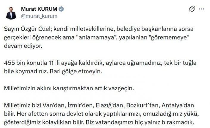 "Sayın Özgür Özel; kendi milletvekillerine, belediye başkanlarına sorsa gerçekleri öğrenecek ama anlamamaya, yapılanları görememeye devam ediyor. 455 bin konutla 11 ili ayağa kaldırdık, aylarca uğramadınız, tek bir tuğla bile koymadınız, bari gölge etmeyin. Milletimizin aklını karıştırmaktan artık vazgeçin. Milletimiz bizi Van’dan, İzmir’den, Elazığ’dan, Bozkurt’tan, Antalya’dan bilir. Her afetten sonra devlet olarak yaptıklarımızı, omuzladığımız yükü, gösterdiğimiz kolaylıkları bilir. Biz vatandaşımızı hiç yalnız bırakmadık. Kısa sürede ayağa kaldırdığımız 11 ilimizde de bu böyle olacak."