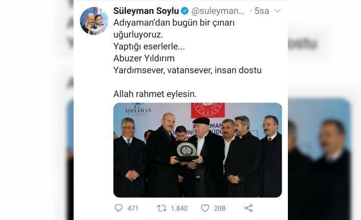 İçişleri Bakanı Süleyman Soylu, iki kez plaket verdiği Adıyamanlı yardımsever iş adamı Abuzer Yıldırım’ın korona virüs nedeniyle hayatını kaybetmesi nedeniyle başsağlığı mesajı yayımladı.