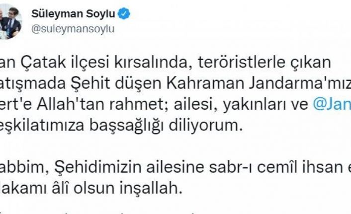 Bakan Soylu, sosyal medya hesabından yaptığı paylaşımda, “Van Çatak ilçesi kırsalında teröristlerle çıkan çatışmada şehit düşen kahraman Jandarmamız Kürşat Sert’e Allah’tan rahmet; ailesi, yakınları ve Jandarma Teşkilatımıza başsağlığı diliyorum. Rabbim, şehidimizin ailesine sabr-ı cemil ihsan eylesin. Makamı âlî olsun inşallah” ifadelerini kullandı.