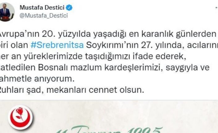 BBP Genel Başkanı Destici, sosyal medya hesabından Srebrenitsa Soykırımı’nın 27. yılı dolayısıyla bir mesaj yayımladı.