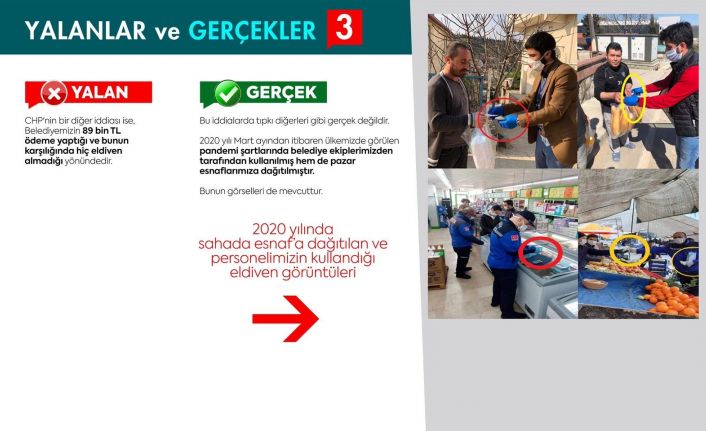 CHP’nin bir diğer iddiasının ise 4 bin 800 plates topunun belediyeye alınmadan, alınmış gibi gösterildiği yönünde olduğunu kaydeden Başkan Şayir, “Tabii ki bu iddiada gerçeği yansıtmamaktadır. CHP’li milletvekilinin bu iddialarını ilçemizdeki birileri de maalesef dillendirmektedir. Faturalar ve görsellerden de görüleceği üzere Belediyemiz 350 adet plates topu ve beraberinde kullanılacak ekipmanlar alınarak halkımızın hizmetine sunulmuştur. Böylece CHP’nin bir iddiası daha belgeleriyle çürütülmüştür. CHP’nin bir diğer iddiası ise, belediyemizin 89 bin lira ödeme yaptığı ve bunun karşılığında hiç eldiven almadığı yönündedir. Bu iddialarda tıpkı diğerleri gibi gerçek değildir. 2020 yılı Mart ayından itibaren ülkemizde görülen pandemi şartlarında sahada çalışan belediye ekiplerimiz ve pazarlarda hem esnafa hemde pazardaki vatandaşlara dağıtılmıştır. Bunun görselleri de mevcuttur” ifadelerini kullandı.