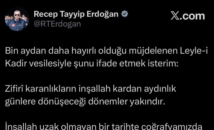 Cumhurbaşkanı Erdoğan, Kadir Gecesi dolayısıyla sosyal medya hesabından yaptığı paylaşımda, "Zifirî karanlıkların inşallah kardan aydınlık günlere dönüşeceği dönemler yakındır" ifadelerini kullanarak barış ve huzur temennisinde bulundu.