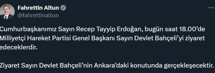 İletişim Başkanı Fahrettin Altun, Cumhurbaşkanı Recep Tayyip Erdoğan’ın Milliyetçi Hareket Partisi (MHP) Genel Başkanı Devlet Bahçeli’yi ziyaret edeceğini bildirdi.