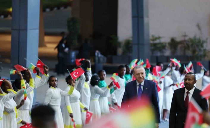 Cumhurbaşkanı Recep Tayyip Erdoğan, resmi ziyarette bulunduğu Etiyopya’da temaslarını sürdürüyor. Cumhurbaşkanı Erdoğan, başkent Addis Ababa’daki Ulusal Saray’da Etiyopya Başbakanı Abiy Ahmed Ali ile düzenlenen ortak basın toplantısının ardından onuruna düzenlenecek akşam yemeği için Addis Ababa Uluslararası Kongre Merkezi’ne geçti. Erdoğan, Başbakan Ahmed Ali ile birlikte kongre merkezi girişinde çocuklar ve gençler tarafından sevinç gösterileriyle karşılandı. Neşeli tezahüratlar eşliğinde Türkiye ve Etiyopya bayraklarını dalgalandıran çocuklar, Cumhurbaşkanı Erdoğan ve Başbakan Ahmed Ali ile fotoğraf çekildi.