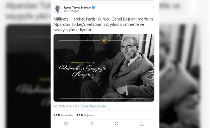 CUMHURBAŞKANI RECEP TAYYİP ERDOĞAN, “MİLLİYETÇİ HAREKET PARTİSİ KURUCU GENEL BAŞKANI MERHUM ALPARSLAN TÜRKEŞ'İ, VEFATININ 23. YILINDA RAHMETLE VE SAYGIYLA YÂD EDİYORUM” İFADELERİNİ KULLANDI.