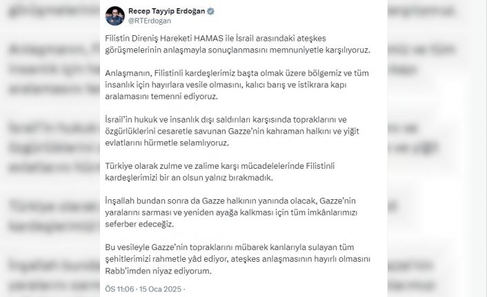 Cumhurbaşkanı Recep Tayyip Erdoğan, Filistin Direniş Hareketi Hamas ile İsrail arasındaki ateşkes görüşmelerinin anlaşmayla sonuçlanmasını memnuniyetle karşıladıklarını ifade etti. Cumhurbaşkanı Erdoğan, "Anlaşmanın, Filistinli kardeşlerimiz başta olmak üzere bölgemiz ve tüm insanlık için hayırlara vesile olmasını, kalıcı barış ve istikrara kapı aralamasını temenni ediyoruz" ifadelerini kullandı.