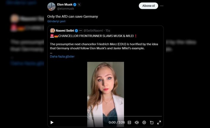 ABD’de yapılan başkanlık seçiminde Cumhuriyetçi aday Donald Trump’ı destekleyen milyarder iş insanı Elon Musk, bu kez Almanya siyasetine ilişkin paylaşım yaptı. Musk, X sosyal medya platformunda Alman sağcı Naomi Seibet’in anketlerde açık ara önde görünen muhafazakarların başbakan adayı Friedrich Merz’i eleştiren mesajını yeniden paylaşarak, "Almanya’yı yalnızca AfD kurtarabilir" ifadelerini kullandı. Alman hükümeti, Musk’ın paylaşımını not aldıklarını belirtti.