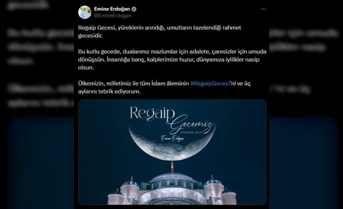 Emine Erdoğan, sosyal medya hesabından yaptığı paylaşımda Regaip Gecesi’nin yüreklerin arındığı, umutların tazelendiği rahmet gecesi olduğunu belirterek, "Bu kutlu gecede dualarımız mazlumlar için adalete, çaresizler için umuda dönüşsün. İnsanlığa barış, kalplerimize huzur, dünyamıza iyilikler nasip olsun. Ülkemizin, milletimiz ile tüm İslam aleminin Regaip Gecesi’ni ve üç aylarını tebrik ediyorum" ifadelerini kullandı.