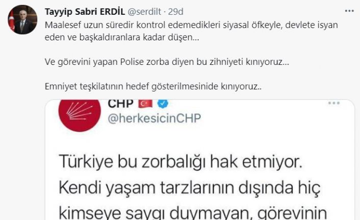 CHP tarafından yapılan paylaşıma tepki gösteren İçişleri Bakan Yardımcısı Erdil ise, "Maalesef uzun süredir kontrol edemedikleri siyasal öfkeyle, devlete isyan eden ve başkaldıranlara kadar düşen ve görevini yapan polise zorba diyen bu zihniyeti kınıyoruz. Emniyet teşkilatının hedef gösterilmesini de kınıyoruz" açıklamasında bulundu.