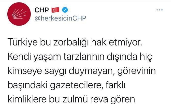 Cumhuriyet Halk Partisi’ne ait resmi sosyal medya hesabından yapılan paylaşımda, "Türkiye bu zorbalığı hak etmiyor. Kendi yaşam tarzlarının dışında hiç kimseye saygı duymayan, görevinin başındaki gazetecilere, farklı kimliklere bu zulmü reva gören zihniyeti kınıyoruz. Cumhuriyetimizin layık olduğu demokrasiyi hep birlikte inşa edeceğiz" ifadeleri yer aldı. Bu paylaşıma cevap veren İçişleri Bakan Yardımcısı Ersoy, "İzinsiz gösteri sırasında polise direnenleri gözaltına almak zorbalık değildir. Esas zorbalık, toplumda iktidara tepki uyandırmak adına, hiçbir sınır tanımadan kurumlarımıza fütursuzca, her türlü yalana sarılarak saldırıp sonrasında özür dileyecek erdemi gösterememektir" ifadelerini kullandı.