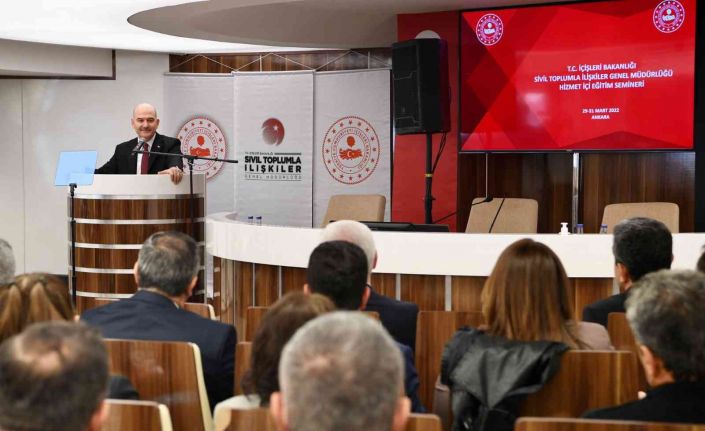 İçişleri Bakanı Süleyman Soylu, beraberinde İçişleri Bakan Yardımcısı Mehmet Ersoy ile birlikte Türkiye Belediyeler Birliği’nde düzenlenen Sivil Toplum İlişkiler Genel Müdürlüğü Hizmet İçi Eğitim Semineri’nin kapanışına katıldı. Törende konuşan Bakan Soylu, “Güvenlik eksenli, bir anlamda korumak eksenli bir konjonktürden geçiyoruz. İstikrarı korumak, güvenliği korumak, doğayı korumak gibi farklı kaygılar ve gayretler içinde bir dünya gündemini yaşıyoruz. Daha da önemlisi, güvenliğin ekosistemi etrafımızda giderek daha da büyüyor. Siyasi istikrarı korumak, ekonomik alanı etkiliyor; sosyal alandaki bir farklılığın üretebileceği çatışma siyasal istikrarı etkiliyor; terör göçü, uyuşturucu terörü, bir virüs salgını yani sağlık, tüm dünyadaki güvenlik dengelerini etkiliyor. Tıpkı bir ağaç ve sürekli büyüyen gölgesi gibi insan aslında sabit, ama güvenliğin alanı giderek büyüyor. Eskiden devletin ve görevli kurumların sadece polis eliyle asayişi, asker eliyle sınırları koruduğu bir dünya modelinden bugün algılarımızın bile dezenformasyonla yönlendirilmesine karşı bir güvenlik ihtiyacı hissediyoruz” ifadelerini kullandı.
