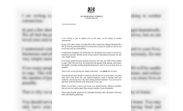 Mektubunda salgını "ulusal acil durum anı" olarak tanımlayan Johnson, hükümetin Ulusal Sağlık Servisi’ne (NHS) baskı yapmamak için evde kalma kurallarını yineledi. Kısıtlamaların aileler üzerinde finansal etkisi olacağını ifade eden Johson, bakanların işçiler ve işletmeler için milyarlarca sterlin yardım edeceğini hatırlattı. Johson, "Hükümet, masaya yiyecek koymanıza yardımcı olmak için ne gerekiyorsa yapacak" dedi.