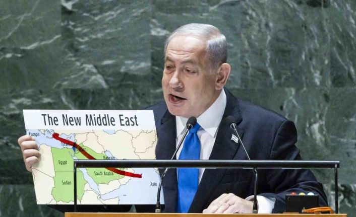 İsrail Başbakanı Binyamin Netanyahu, Birleşmiş Milletler Genel Kurulu’nda Filistin’in olmadığı bir harita sunarken, “İsrail ile Suudi Arabistan arasındaki barışın tarihi bir eşikte olduğuna inanıyorum” dedi.