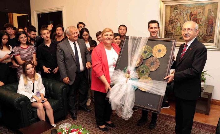 Kılıçdaroğlu’na, genç rölyef sanatçısı Armağan Atadağ’ın kirpi oku ile işlediği tabloyu hediye eden Başkan Erdem, Türkiye’nin çağdaş, güvenli ve aydınlık yarınlara gençler sayesinde erişeceğini söyledi.