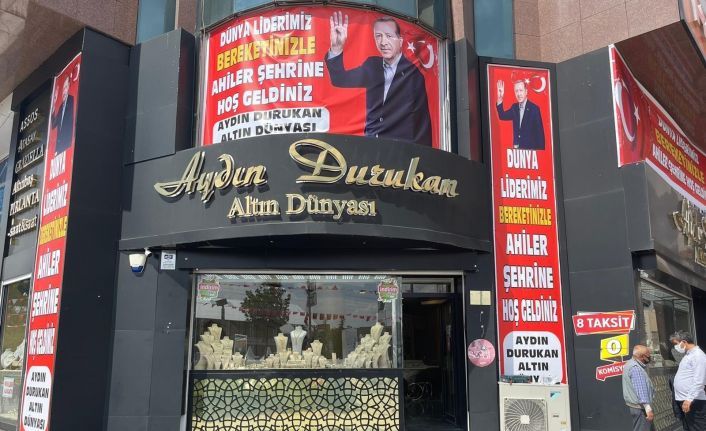 Kırşehir, Cumhurbaşkanı Recep Tayyip Erdoğan’ı ağırlamaya hazırlanırken, kuyumculuk yapan bir esnaf da işyerine ’Bereketinle Gel Erdoğan’ pankartı astı.