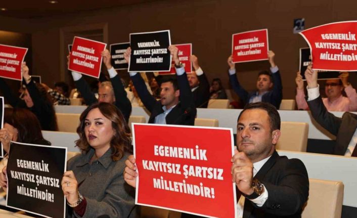 Yücel Akbulut’un konuşmasının ardından CHP’li belediye meclis üyeleri, “Egemenlik kayıtsız şartsız milletindir” yazılı dövizleri açarak alkışlarla kararı protesto etti.