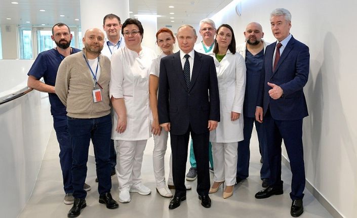 Toplantının ardından Moskova’da korona virüsü taşıyan hastaların tedavi gördüğü bir hastaneye ziyaret gerçekleştiren Putin’e özel kıyafetler giydirildi. Koruyucu tulum giyen Putin, hastaların durumları hakkında sağlık ekibinden de hastalara dair bilgiler aldı. Putin, "Virüsle mücadelede hastane personelinin nasıl çalıştığını gördüm. Herkes çok iyi koordine edilmiş ve saat gibi çalışıyorlar. Onlar ne yapılması gerektiğini çok iyi biliyor. Hastanede tüm ekipmanlar bulunuyor ve bu ekipmanlar kullanılıyor" dedi. Hastane çalışanlarına hitaben bir konuşma yapan Putin, "Tedavisi tamamlanan insanlar için bambaşka bir yaşam başlıyor. Bu insanların tümü size teşekkür ediyor" ifadelerini kullandı.