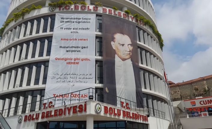 Bolu Belediye Başkanı Tanju Özcan’ın belediye binasına astırdığı geçici sığınmacılara yönelik Türkçe ve Arapça ifadelerin yer aldığı pankart seçim yasakları çerçevesinde indirildi.