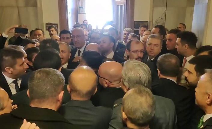 İÇİŞLERİ BAKANI ALİ YERLİKAYA SALONA GİRDİĞİ SIRADA TARTIŞMALARIN BÜYÜMESİ ÜZERİNE GERGİNLİK ARTTI. BAKAN YERLİKAYA, YAŞANAN GERGİNLİKTE SALONA GÜÇLÜKLE GİREBİLDİ.