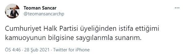 CHP 27. Dönem Denizli milletvekili Haşim Teoman Sancar, sosyal medya hesabından yaptığı açıklama ile partisinden istifa ettiğini açıkladı. Sancar’ın yaptığı açıklamada, “Cumhuriyet Halk Partisi üyeliğinden istifa ettiğimi kamuoyunun bilgisine saygılarımla sunarım” ifadeleri yer aldı. Sancar’ın partisinden istifasının ardından Muharrem İnce’nin yeni kuracağı partiye mi katılacağına ilişkin soru işaretleri oluştu. Ayrıca Sancar, geçtiğimiz günlerde CHP’den istifa etmeyeceklerini açıklayan 17 milletvekili arasında yer alıyordu.