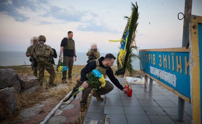 Ukrayna Devlet Başkanı Vladimir Zelenskiy, Karadeniz’deki Yılan Adası’nı ziyaret ettiği anların videosunu paylaştı. Bugün savaşın 500. günü olduğunu vurgulayan Zelenskiy, Yılan Adası’nı "özgür Ukrayna’nın özgür adası" olarak nitelendirdi. Zelesnkiy Rus ordusuna karşı savaşan herkese teşekkür ederek, "Topyekun savaşın en önemlilerinden biri olan bu muharebede hayatlarını kaybeden kahramanları andık. Karadeniz’imizde güvenlik için mücadele edenlere şan olsun" ifadelerini kullandı. Zelenskiy, Rus ordusuna karşı adayı savunan askerlerin anısına suya çiçek bıraktı.