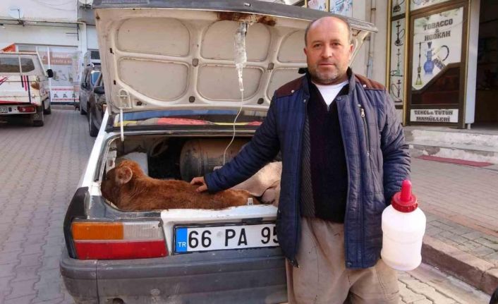 Yozgat’ta besici Ali Kunduz, hastalanan 20 günlük buzağısını arabasının bagajında veteriner hekime götürdü. İshal teşhisi konulan buzağıya araba bagajında serum takıldı. Hayvan sahibi de serum bitene kadar buzağının başında bekledi.