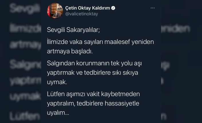 Sakarya Valisi Çetin Oktay Kaldırım, artan vakalara karşı sosyal medya hesabından uyardı.