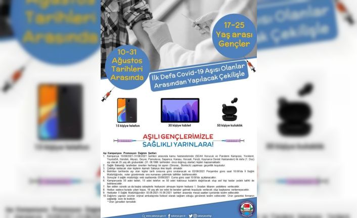Sakarya Valiliği koordinesinde İl Sağlık Müdürlüğü, 25 yaş altı gençleri aşıya teşvik etmek için ilk kez korona virüs aşısı olacaklara çekilişle hediyeler vereceğini sosyal medya hesabından duyurdu.