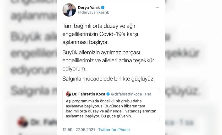 Sağlık Bakanı Fahrettin Koca, sosyal medya hesabından yaptığı paylaşımla tam bağımlı orta düzey ve ağır engelli vatandaşların Covid-19 aşılama programına alındığını duyurmuştu. Aile ve Sosyal Hizmetler Bakanı Derya Yanık, Koca’nın bu haberi duyurmasının ardından engelliler ve aileleri adına Koca’ya teşekkür etti. Bakan Yanık sosyal medya hesabından yaptığı teşekkür paylaşımında, “Tam bağımlı orta düzey ve ağır engellilerimizin Covid-19’a karşı aşılanması başlıyor. Büyük ailemizin ayrılmaz parçası engellilerimiz ve aileleri adına teşekkür ediyorum. Salgınla mücadelede birlikte güçlüyüz” ifadelerine yer verdi.Bakan Yanık’tan Sağlık Bakanı Koca’ya teşekkür