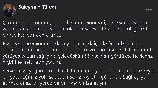 Trabzon Kanuni Eğitim ve Araştırma Hastanesi Başhekimi Prof. Dr. Süleyman Türedi Trabzon’da artan Korona virüs vakalarına rağmen sahil kenarında yürüyüş yapanlara sosyal medya hesabından sitemde bulunarak, “Tüm eforumuzu harcarken sahil kenarında yürüyüş yapan sağlığına çok düşkün ! insanları gördükçe hakkımızı hiçbirine helal etmiyorum” paylaşımında bulundu.