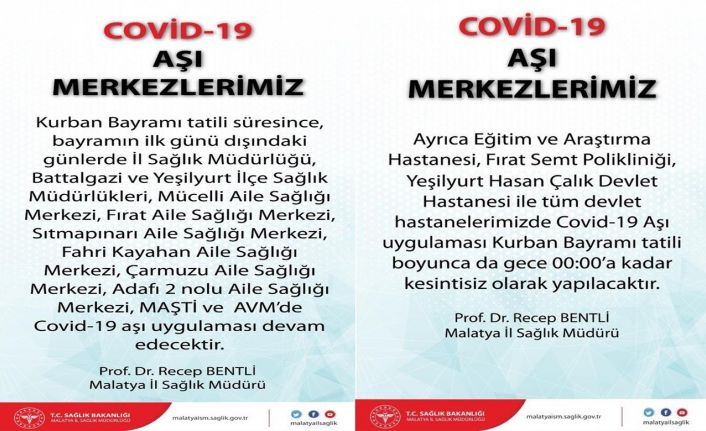 Malatya İl Sağlık Müdürü Prof. Dr. Recep Bentli yaptığı açıklamada, Kurban Bayramı’nın ilk günü dışındaki bayram günlerinde Covid-19 aşı çalışmasının devam edeceğini bildirerek, "Eğitim ve Araştırma Hastanesi, Fırat Semt Polikliniği ve Yeşilyurt Hasan Çalık Devlet Hastanesi’nde Kurban Bayramı tatili boyunca gece 00.00’a kadar aşı çalışması kesintisiz devam edecektir” dedi.