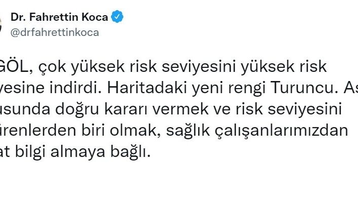 Bingöl’ün aşı çalışmalarında yüksek risk seviyesine indiğini sosyal medya hesabından duyuran Sağlık Bakanı Fahrettin Koca, "Bingöl, çok yüksek risk seviyesini yüksek risk seviyesine indirdi. Haritadaki yeni rengi Turuncu. Aşı konusunda doğru kararı vermek ve risk seviyesini düşürenlerden biri olmak, sağlık çalışanlarımızdan bizzat bilgi almaya bağlı" açıklamasında bulundu.