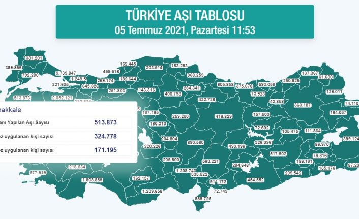 Sağlık Bakanlığı koordinasyonunda Çanakkale Merkez ve ilçelerinde yürütülen aşı çalışmalarında mobil sağlık ekipleri ve yeni kurulan aşı çadırları ile daha fazla kişiye ulaşıldı. Çanakkale’deki aşılamalarda birinci dozda 324 bin 778, ikinci dozda ise 171 bin 195 kişi olmak üzere toplam 513 bin 873 aşılama rakamına ulaşıldı. Sağlık Bakanı Dr. Fahrettin Koca’nın yaptığı açıklamaya göre, nüfusa göre en çok aşı yapılan iller arasında Çanakkale ikinci sırada yer alıyor.