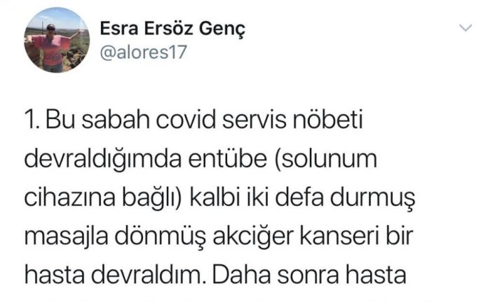 Asistan doktor Esra Ersöz Genç, hasta yakınları ile yaşadığı o anları sosyal medya hesabından paylaşarak, İçişleri ve Sağlık Bakanlığı’ndan yardım istedi. 5 şahsın oksijen tüpü ile kendilerini kovaladığını belirten Genç, "Bu sabah covid servis nöbeti devrldığımda entübe (solunum cihazına bağlı) kalbi iki defa durmuş masajla dönmüş akciğer kanseri bir hasat devraldım. Daha sonra hasta yakınlarına durumu hakkında bilgi verdim. Hastanın kalbi gün içinde birçok kez durdu, kalbi tansyon oluşturamıyor, hiçbir uyutucu ilaç almadığı halde kendi kendine soluyamıyordu. Bir taraftaki ciğeri tamamen alındığı için ciğerine tüp takıldı. Hastanın kalbi son bir defa daha durdu. Tüm müdahalelere rağmen kurtarılamadı. Olayda burada başladı. Önce zorla kapalı servise girmeye çalıştılar. Kapılar camlar kırıldı güvenlik ile beraber ben kapının dışında hırpalandık. (Elimdeki kesikler bu arada oldu sanırım) sonra servisin iç kapısını da zorla açarak 5 kişi içeri daldılar. Bizim tulumlarla maskelerle girdiğimiz servise ellerini kollarını sallayarak girip sağa sola tekme atarak vefat eden hastanın başına geçtiler. İçlerinden biri eline oksijen tüpünü alıp bizi kovalamaya başladı. O tüpü bize takacakmış, polis geldiğinde öyle diyordu.Beni servisten nasıl çıkardılar bilmiyorum. Benim yaşadığım şok, adli muayenem, pansumanım, ifade vermem, şahsın gözaltı süresinden uzun tuttu. Şimdi bu adam dışarıda. Sağlıkta şiddet yasası çıktı diyorlar. Ben kendimi güvende hissetmiyorum. Bir daha nöbette ne olacak. Evime aileme sağ sağlam dönebilecek miyim bilmiyorum. Korkuyorum duyuyor musunuz beni?" ifadelerini kullandı.