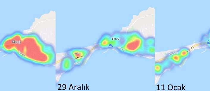 Sinop’da HES uygulamasından 27 Kasım, 29 Aralık ve 11 Ocak tarihlerinde zaman aralıklarıyla alınan görüntüler korona virüsünde vaka sayılarındaki düşüşü gözler önüne serdi. 47 gün önce ‘yüksek risk’i temsil eden kırmızı rengin yoğunluğu dikkati çekerken, şu anda şehre ‘düşük risk’ anlamındaki yeşil ve mavi renkler hakim oldu.