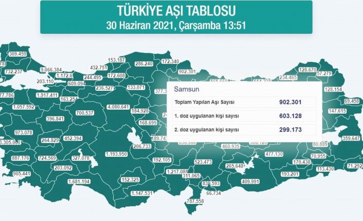 Artvin’de 85 bin 34 birinci doz, 43 bin 636 ikinci doz olmak üzere 128 bin 670 doz aşı uygulandı. Rize’de 155 bin 290 birinci doz, 79 bin 175 ikinci doz olmak üzere 234 bin 465 doz aşı uygulandı. Trabzon’da 364 bin 12 birinci doz, 190 bin 226 ikinci doz olmak üzere 554 bin 238 doz aşı uygulandı. Bayburt’ta 26 bin 888 birinci doz, 13 bin 432 ikinci doz olmak üzere 40 bin 320 doz aşı uygulandı. Gümüşhane’de 44 bin 377 birinci doz, 25 bin 145 ikinci doz olmak üzere 69 bin 522 doz aşı uygulandı. Tokat’ta 266 bin 220 birinci doz, 139 bin 228 ikinci doz olmak üzere 405 bin 448 doz aşı uygulandı. Giresun’da 224 bin 544 birinci doz, 125 bin 469 ikinci doz olmak üzere 350 bin 13 doz aşı uygulandı. Ordu’da 375 bin 898 birinci doz, 189 bin 762 ikinci doz olmak üzere 565 bin 660 doz aşı uygulandı. Samsun’da 603 bin 128 birinci doz, 299 bin 173 ikinci doz olmak üzere 902 bin 301 doz aşı uygulandı. Amasya’da 178 bin 155 birinci doz, 88 bin 481 ikinci doz olmak üzere 266 bin 636 doz aşı uygulandı. Sinop’ta 109 bin 571 birinci doz, 62 bin 769 ikinci doz olmak üzere 172 bin 340 doz aşı uygulandı. Çorum’da 253 bin 347 birinci doz, 123 bin 993 ikinci doz olmak üzere 377 bin 340 doz aşı uygulandı. Kastamonu’da 185 bin 434 birinci doz, 100 bin 806 ikinci doz olmak üzere 286 bin 240 doz aşı uygulandı. Karabük’te 114 bin 493 birinci doz, 58 bin 115 ikinci doz olmak üzere 172 bin 608 doz aşı yapıldı. Bartın’da 103 bin 453 birinci doz, 49 bin 734 ikinci doz olmak üzere 153 bin 187 doz aşı yapıldı. Zonguldak’ta 291 bin 212 birinci doz, 141 bin 539 ikinci doz, 432 bin 751 doz aşı uygulandı. Bolu’da 159 bin 119 birinci doz, 77 bin 408 ikinci doz olmak üzere 236 bin 527 doz aşı uygulandı. Düzce’de 169 bin 625 birinci doz, 74 bin 870 ikinci doz olmak üzere 244 bin 495 doz aşı uygulandı.