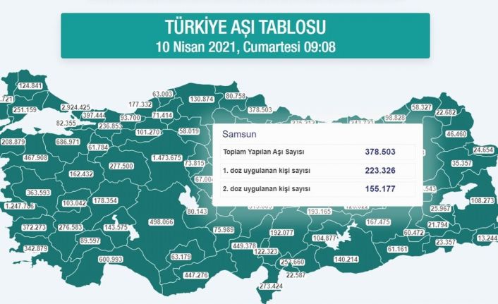 10 Nisan 2021 itibariyle Türkiye genelinde 10 milyon 855 bin 123 birinci doz, 7 milyon 575 bin 795 ikinci doz olmak üzere toplam 18 milyon 430 bin 918 doz aşı uygulanmış oldu. Türkiye’de yapılan 10 milyon 855 bin 123 birinci doz aşının 1 milyon 403 bin 676’sı Karadeniz Bölgesi’nde bulunan 18 ilde uygulandı. Aynı zamanda Türkiye’de yapılan 7 milyon 575 bin 795 ikinci doz aşının 998 bin 624 dozu da Karadeniz’deki illerde uygulandı. Öte yandan Türkiye genelinde uygulanan 18 milyon 430 bin 918 doz aşıdan 2 milyon 402 bin 300 dozu yine Karadeniz’deki illerde uygulandı.