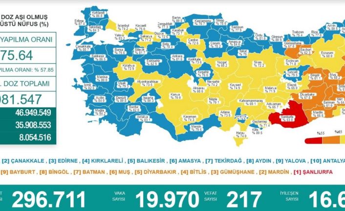 19 tablosuna göre ‘mavi’ olmayan sadece 4 il kaldı. Gümüşhane, Karabük, Bayburt ve Düzce hariç diğer 14 il aşılamada mavi renge döndü.