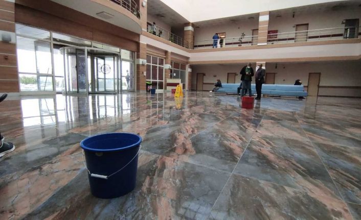 Kars’ta yağmur ve kar yağışında damlayan üniversite hastanesine kovalı önlem alındı. Çatılardaki delikleri, onarma yoluna gitmeyen hastane yönetimi onlarca kova alarak yağmur damlalarının altına koydu.