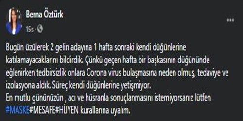 Öztürk’ün açıklaması ise şöyle: “Bugün üzülerek 2 gelin adayına 1 hafta sonraki kendi düğünlerine katılamayacaklarını bildirdik. Çünkü geçen hafta bir başkasının düğününde eğlenirken tedbirsizlik onlara korona virüs bulaşmasına neden olmuş, tedaviye ve izolasyona aldık. Süreç kendi düğünlerine yetişmiyor. En mutlu gününüzün, acı ve hüsranla sonuçlanmasını istemiyorsanız lütfen maske, mesafe, hijyen kurallarına uyalım.”