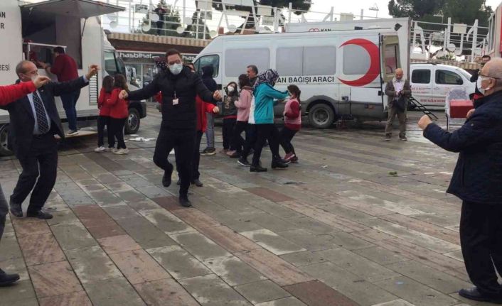 Manisa’nın Alaşehir ilçesinde Manisa Kızılay Kan Merkezi Müdürlüğü tarafından düzenlenen kan bağışı kampanyası yoğun ilgi görüyor. Cumhuriyet Meydanı’nda kurulan çadırlar ve gezici mobil kan alma merkezinde çalan müziklere dayanamayan bazı vatandaşlar önce Kızılay ekipleri ile karşılıklı oynadı, ardından da kan bağışında bulundu.