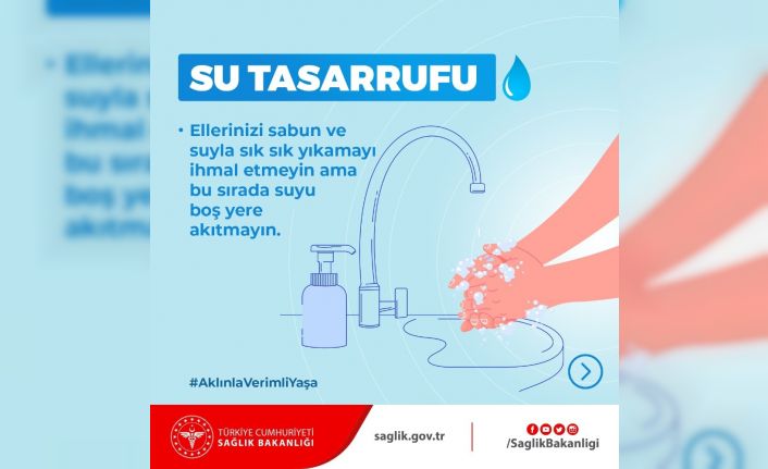 Sağlık Bakanlığı, sosyal medya hesabından su tasarrufu uyarısında bulundu. Bakanlığın hesabından yapılan paylaşımda, "Ellerinizi sabun ve suyla sık sık yıkamayı ihmal etmeyin ama bu sırada suyu boş yere akıtmayın" denildi.
