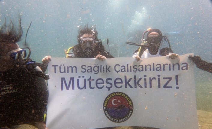 Edirne’nin Saros Körfezi’nde dalış yapan ’Derinlere Saygı Dalışı Topluluğu’ üyeleri, açtıkları pankartla tüm sağlık çalışanlarına teşekkür etti. Dalış ekibinde biri Covid-19’u atlatan iki doktor da yer aldı.