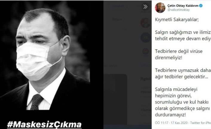 Sakarya Valisi Çetin Oktay Kaldırım, kentte salgın için alınan tedbirlerin uygulanma konusuna dikkat çekerek salgın tehdidinin devam ettiğini sosyal medya hesabından bir kez daha açıkladı. Twitter hesabından açıklama yapan Vali Kaldırım, salgının sürecinde alınan tedbirlere uyulmadığı sürece daha ağır tedbirler alınacağını vurguladı. Kaldırım yaptığı açıklamada, “Kıymetli Sakaryalılar. Salgın, sağlığımızı ve ilimizi tehdit etmeye devam ediyor. Tedbirlere değil virüse direnmeliyiz. Tedbirlere uymazsak daha ağır tedbirler gelecektir. Salgınla mücadeleyi hepimizin görevi, sorumluluğu ve kul hakkı olarak görmedikçe salgını durduramayız” ifadelerine yer verdi.Sakarya Valisi Kaldırım uyardı: “Tedbirlere uymazsak daha ağır tedbirler gelecektir”