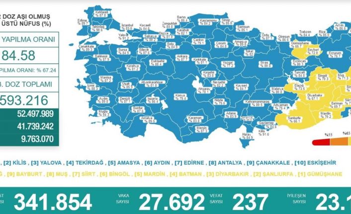 Türkiye genelinde 1. doz aşı yapılma oranı yüzde 84,58 oldu. 2. doz aşı yapılma oranı yüzde 67,24 olurken, 1., 2. ve 3. doz aşı toplamı ise 104 milyon 593 bin 216 oldu.