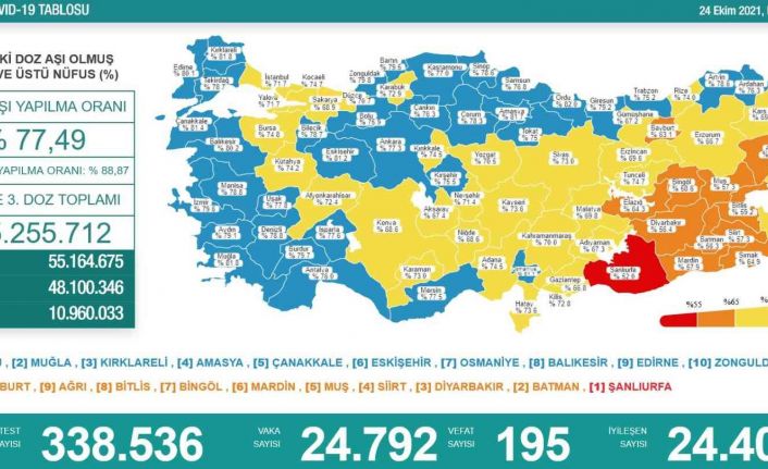 Sağlık Bakanlığı tarafından Türkiye’nin yeni korona virüs tablosu açıklandı. 21 Ekim’de açıklanan 24 saatlik verilere göre 24 bin 792 vaka tespit edildi. Virüs nedeniyle hayatını kaybedenlerin sayısı 195 oldu. Bir günde toplam 338 bin 536 test yapılırken, iyileşen hasta sayısı 24 bin 403 olarak kaydedildi. Sağlık Bakanlığı tarafından açıklanan tabloda, aşılama verilerine de yer verildi. En az 2 doz aşısını olmuş 18 yaş üzeri nüfusu kapsayan verilere göre Türkiye’de 2. doz aşılama ortalama yüzde 77,49 oldu. 1. doz ortalaması yüzde 88,87 olurken, 1., 2. ve 3. doz aşısını olan vatandaş sayısı toplamda 115 milyon 255 bin 712’e yükseldi.