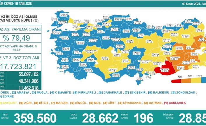 Sağlık Bakanlığı tarafından Türkiye’nin yeni korona virüs tablosu açıklandı. 9 Kasım’da açıklanan 24 saatlik verilere göre 28 bin 662 vaka tespit edildi. Virüs nedeniyle hayatını kaybedenlerin sayısı 196 oldu. Bir günde toplam 359 bin 560 test yapılırken, iyileşen hasta sayısı 28 bin 859 olarak kaydedildi. Sağlık Bakanlığı tarafından açıklanan tabloda, 2 doz aşılama verilerine de yer verildi. En az 2 doz aşı olmuş 18 yaş üzeri nüfusu kapsayan verilere göre Türkiye’de 2. doz aşılama ortalama yüzde 79,49 oldu. 1. doz ortalaması yüzde 89,73 olurken, 1., 2. ve 3. doz yapılan toplam aşı sayısı 117 milyon 723 bin 821’e yükseldi.